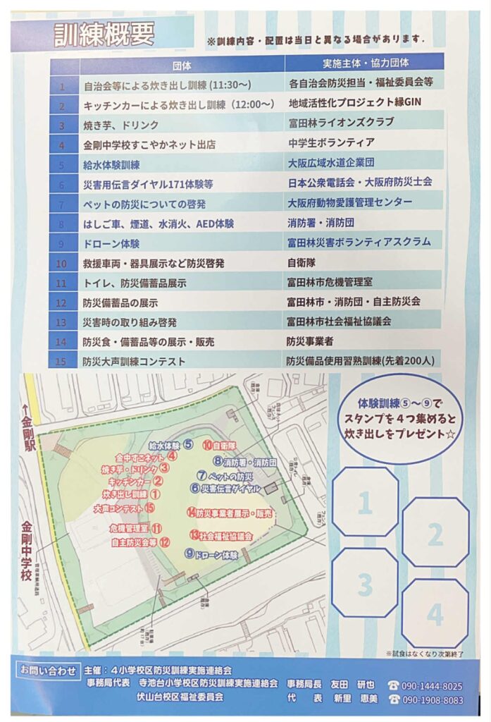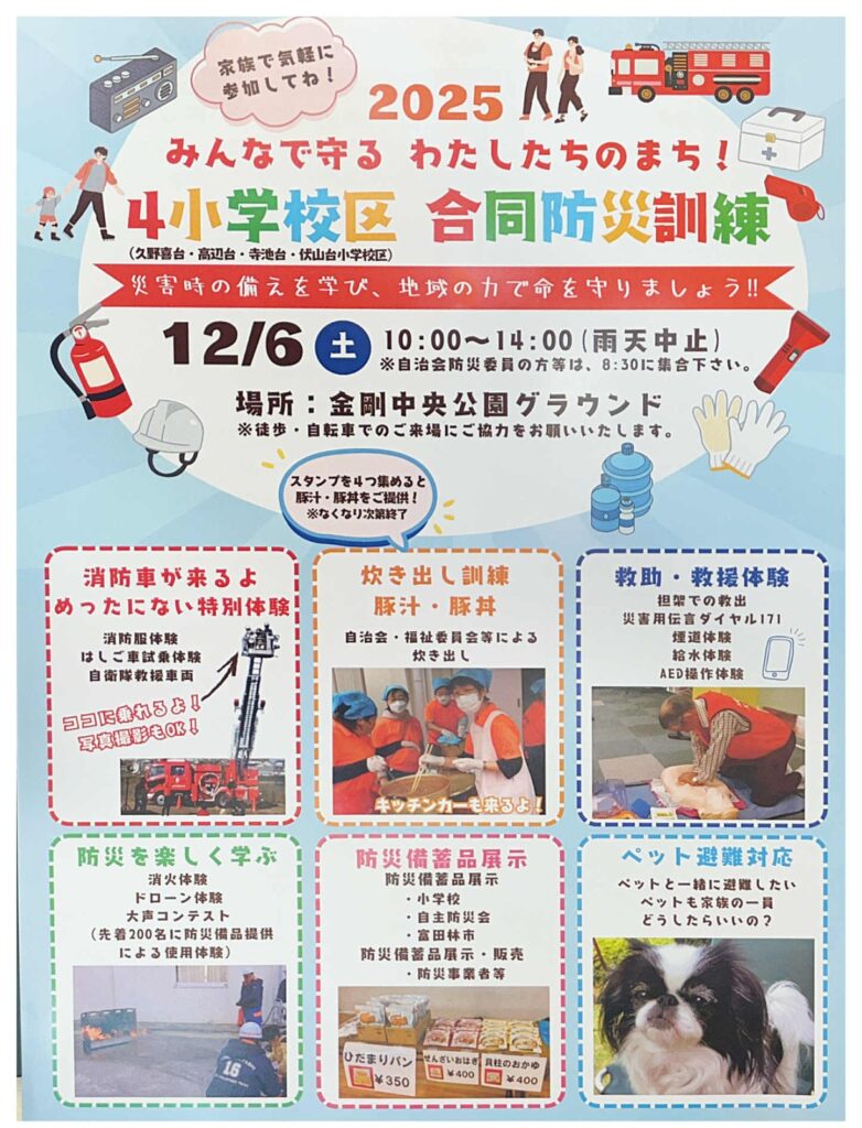 4小学校区 合同防災訓練 2025年11月13日 最終更新日時 : 2025年11月13日 discoverkongo 災害時の備えを学び、地域の力で命を守りましょう!久野喜台、高辺台、寺池台、伏山台の4小学校区合同の防災訓練です。 日時:12/6(土)10時~14時(雨天中止)場所:金剛中央公園グランド