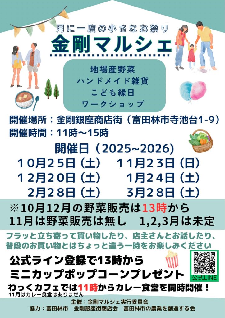 <金剛マルシェ>開催のお知らせ(金剛マルシェ実行委員会) 2026年3月26日 最終更新日時 : 2026年3月28日 discoverkongo 毎月第4土曜に開催地場産やさい市、ハンドメイド雑貨、キッチンカーなどなど~開催時間は 11時~15時 ◆ 会場:金剛銀座街商店街前広場(寺池台1-9)◆ 主催:金剛マルシェ実行委員会